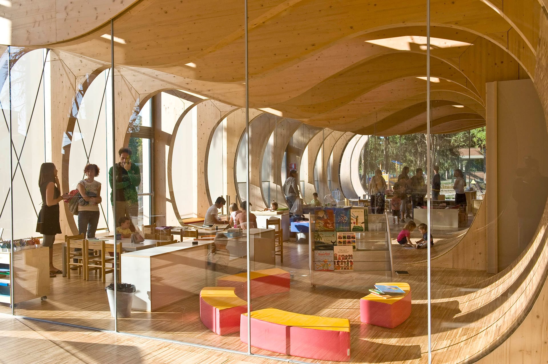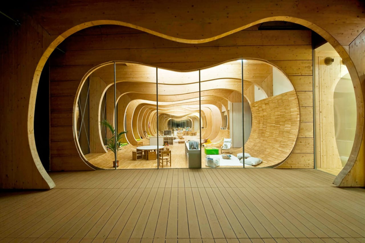 Alla base del progetto, uno spazio di oltre 1400 metri quadrati che può ospitare fino a 120 bambini dagli 0 ai 3 anni, vi una struttura concepita secondo apertura mentale e spaziale. Difatti non ci sono muri divisori ma vetri, non vi sono materiali soffocanti ma telai di legno curvi che ricordano il ventre di una balena e sono a basso impatto ambientale. A completare l’edificio un sistema di pannelli fotovoltaici, un sistema di riciclo dell’acqua piovana per il riutilizzo nel giardino.